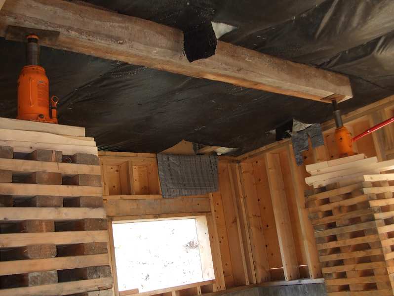 Lucky for us we have friends and family that are experienced in moving and placing big things. So we borrowed a dozen 20-ton jacks and some heavy duty come-along-s, and used some fir 6x6 fencepost scrap from the sawmill and a large cache of blocking, to jack the entire front half up and winch it into position. Now... I have to take blame for part of the difficulty adjusting the pieces. In Canada, it is acceptable to notch the top half of the double-plate while placing a modular house piece to allow relief and removal of the crane lifting-straps. I didn't want to do that. In the U.S. Mostly. They set the piece on blocking, on the plates, then jack the piece up, remove the blocks and lower the piece down. Without cutting the top plates. I just built these basement walls. I didn't want to cut into my brand-new plates if I didn't have to. So of course... We're on blocks.