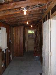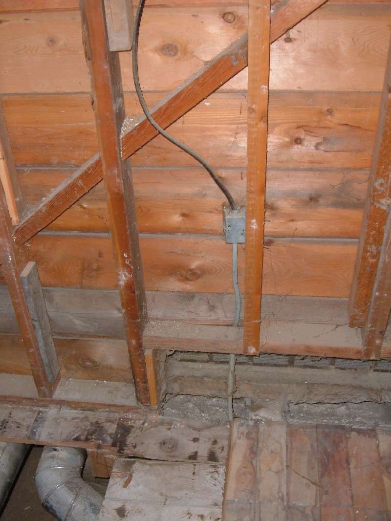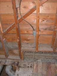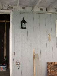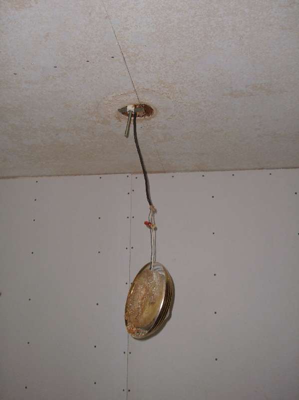 On the right... There is a light fixture which was attached, through an extension cord, to a wire in the attic and fastened with scotch-tape. It was suspended by a few pieces of wood and some coat-hangers. Sorry... This one is really hard to describe. Anyway... The real tragedy here is that whom ever did this work made it totally unsafe to even change the light bulb in this fixture. Sadly... The original wire, and junction-box, were still in the attic and only needed to be restored, in their original place, to correct the hazard. And... Now that it's back up to code we were able to reuse a fan-light we salvaged from elsewhere in the house.