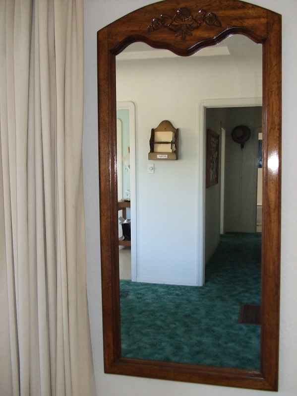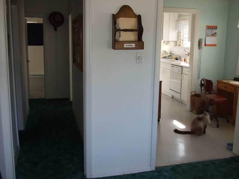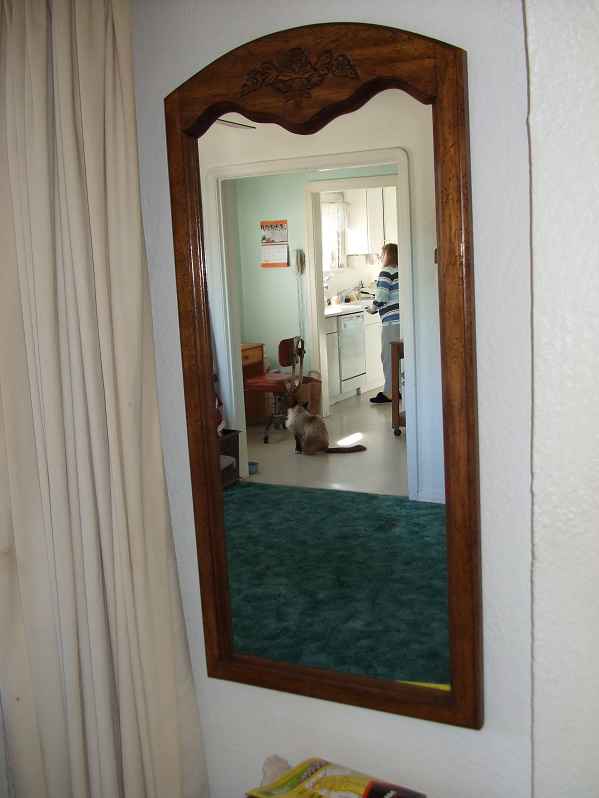 There is also the matter of the mirror. It has been placed in a very strategic location with the focal point being Beryl's perch. The only spot she sits in. From that point she can monitor the front of the house, the driveway, and keep an eye on the entire inside. The only spot that is uncovered is the back door. If you have reached the back door then you have been undoubtedly seen coming up the driveway. Either way there is nowhere to go except for out the back door without coming back within her view. She seems to be a little paranoid. Anyway... From this stoop; She rules this empire.