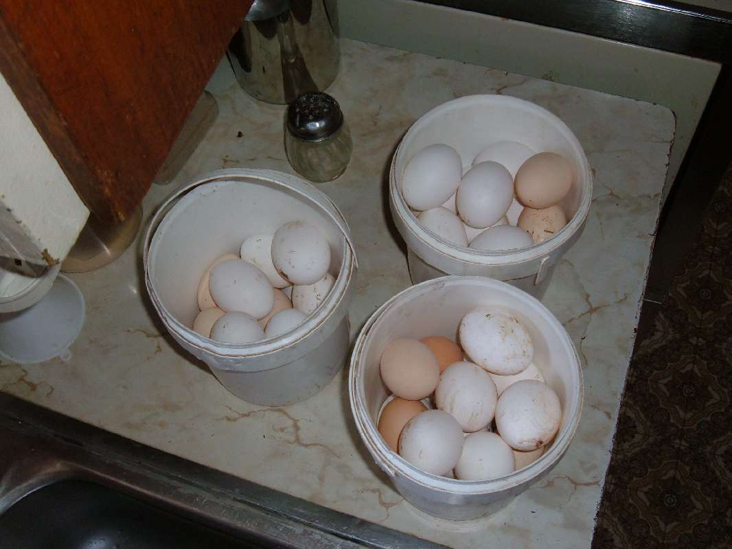 There are also casualties in the egg business. If you look to the top of the picture. At the sink corner. There are two eggs that had cracked shells. Sorted out in final inspection these became treats for the dogs.