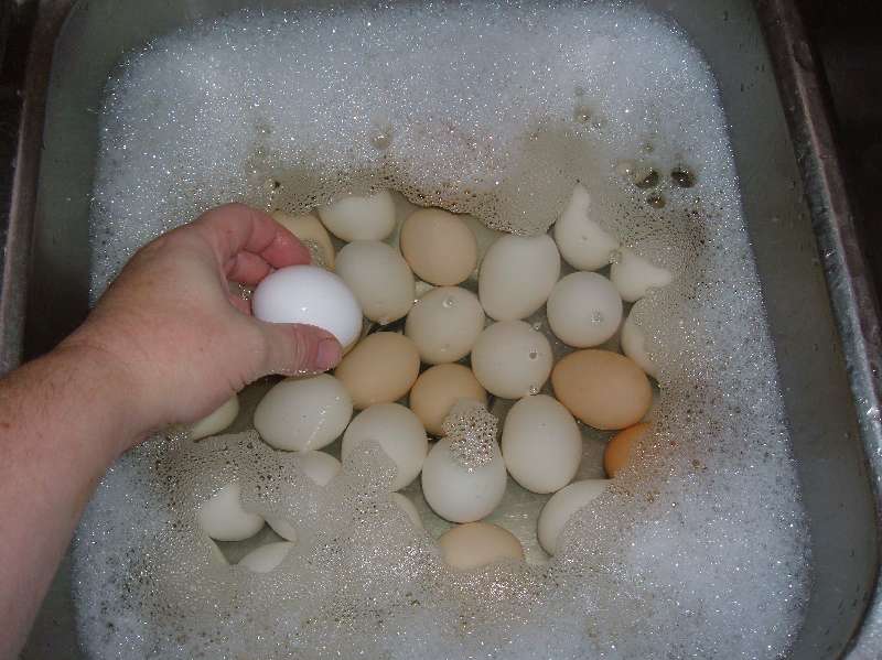 First thing is to rinse them in cool water. I'll define cool water. Cool water is slightly heated. If it weren't for the heating the spring water in the winter would give one frostbite before they could finish washing their hands. So... Cool water. My rinse also makes sure that the outside shell is waste free. The eggs are then soaked in a luke-warm (room temperature) bath with detergent. This ensures that the eggs are dead and helps final-clean the outside shell.