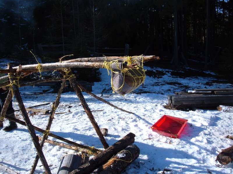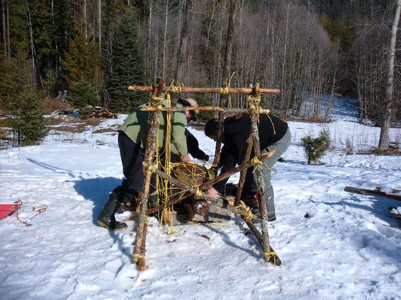 Anyways... We had to venture into the spooky, not, forest to get kindling for the bon-fire. While we're there I noticed some rails laying around (dead fallen saplings). Hmmm I thought... Can I use those. Next thing you know I had collected enough forest slag to construct a 'Trebuchet'. Ok... A small trebuchet. An experimental version.